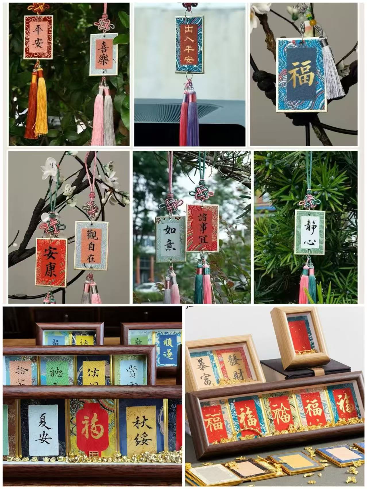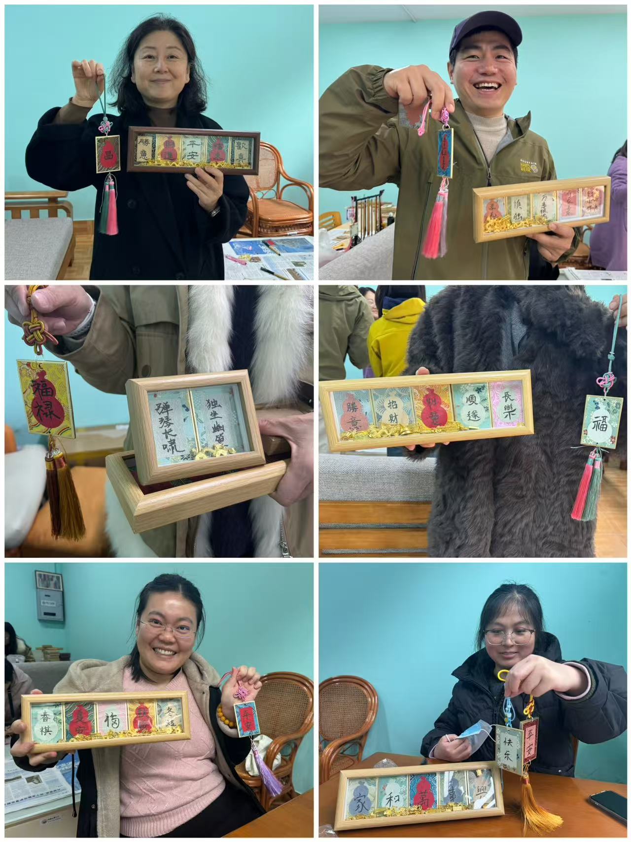 活动期间,工会小家里洋溢着宁静而专注的氛围。老师们细细端详锦纹的脉络,斟酌字句布局,或挥毫写下“平安”“康乐”“家和”等寄托心意的词语,或抄录喜爱的诗句格言。硬卡挺括的质感与宋锦的华美纹理相得益彰,墨迹落于其上,更显庄重典雅。不少老师发挥创意,搭配流苏、挂绳等配件,完成了一件件独具个人风格与情感温度的作品。
